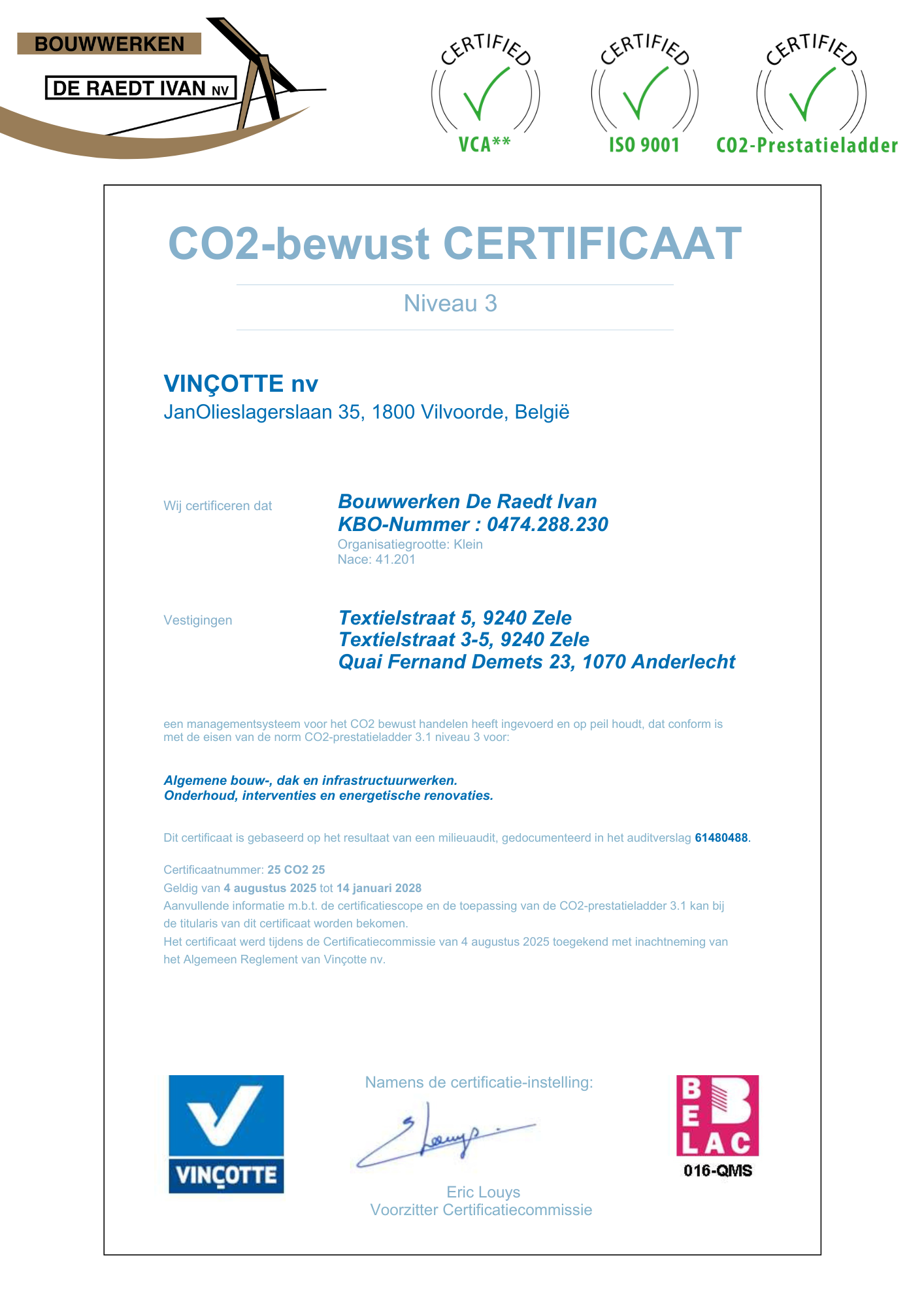 Bij Bouwwerken De Raedt Ivan nv streven we naar continue verbetering op het vlak van milieu, welzijn en duurzaamheid en daarom engageren we ons voor de CO₂-Prestatieladder.